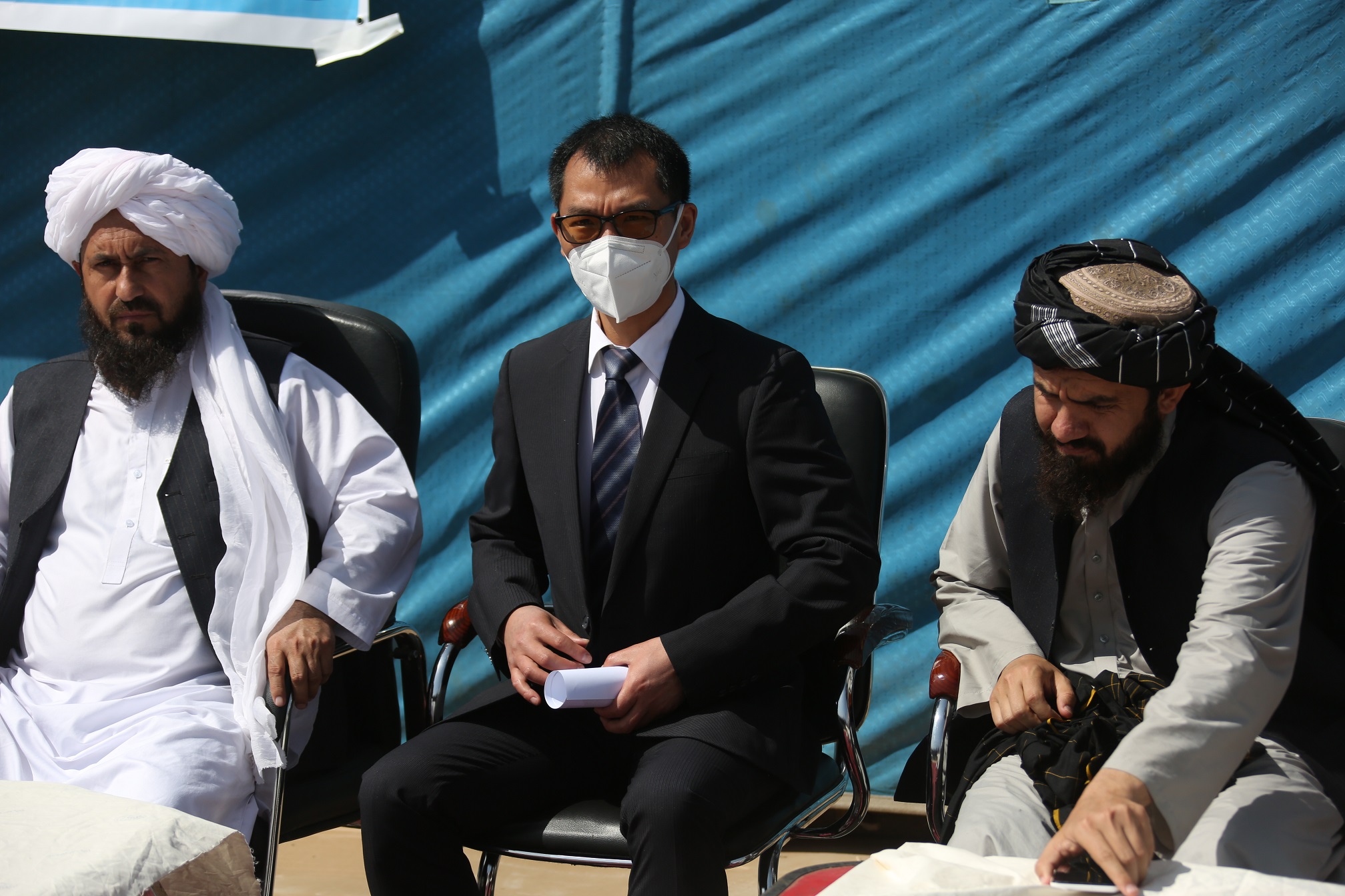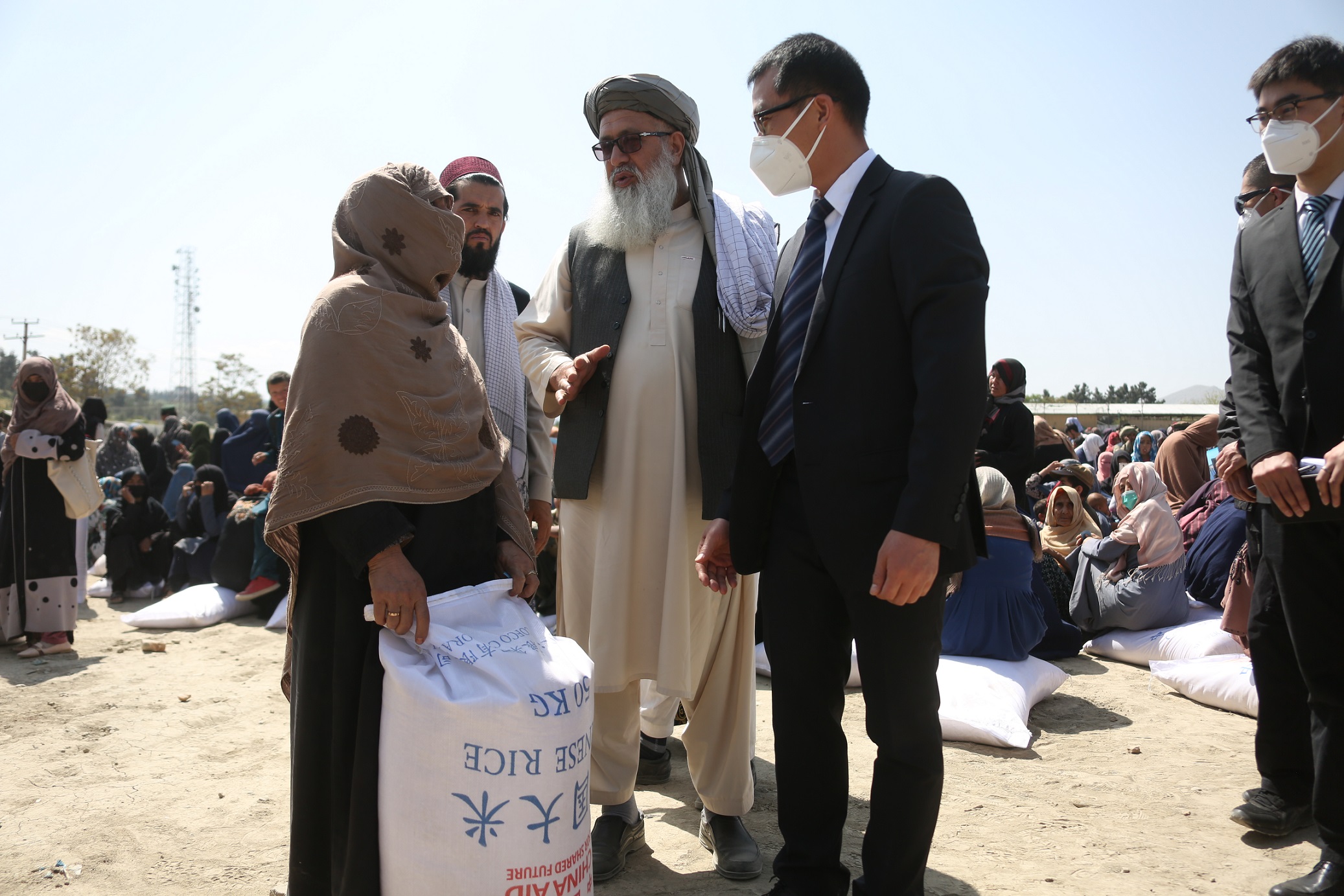 4月7日,中国政府对阿人道物资援助第五批粮食分发仪式在喀布尔举行,阿临时政府难民事务部代理副部长阿尔萨拉.哈里提,中国驻阿使馆经商参赞胡国爱出席。
